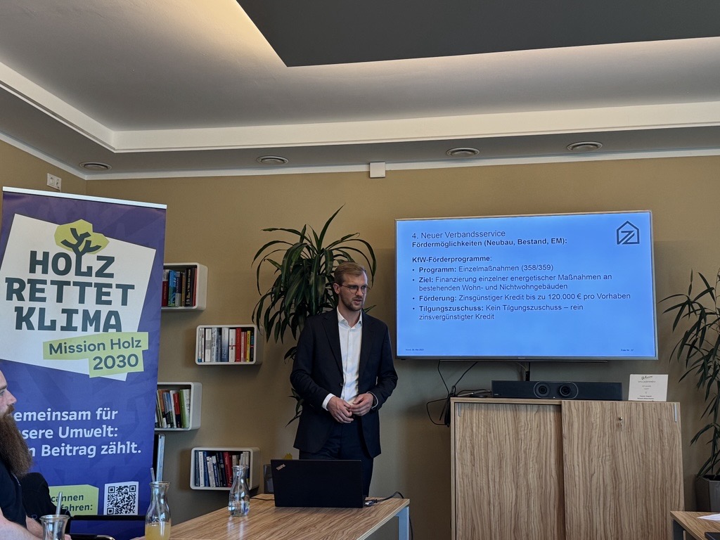 Zum Abschluss der Versammlung sprach Valentin Klingler, Referent des Landesinnungsverbands des Bayerischen Zimmererhandwerks, über die politischen Rahmenbedingungen für den Holzbau. Er gab Einblicke in die verbandlichen Aktivitäten zur Nachhaltigkeit und erläuterte die geplanten Neuerungen der Bayerischen Bauordnung ab 2025.